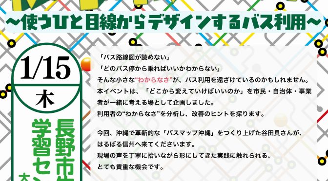 今回、沖縄で革新的な「バスマップ沖縄」をつくり上げた谷田貝さんが、はるばる信州へ来てくださいます。